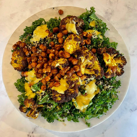 Quinoa, mixed herbs, kale, chickpeas, brussel sprouts and pecan salad.