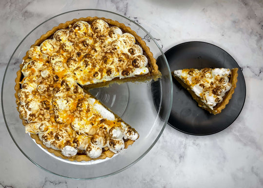 Pumpkin meringue pie with roasted hazelnuts and orange zest