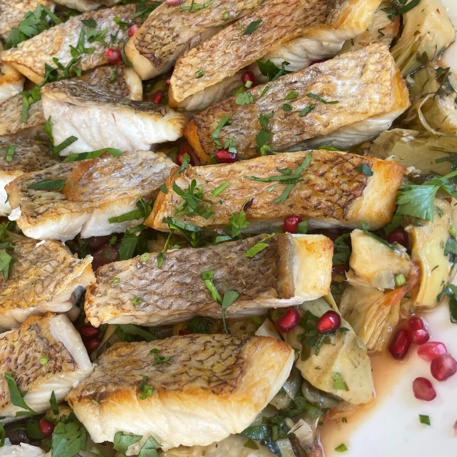 1kg Snapper Fillets with artichoke hearts, zucchini, salsa verde + olives.